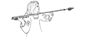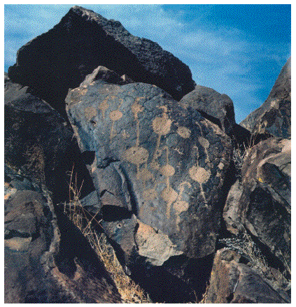Images of some hunters are shown with bows, arrows, and dogs. However, some of the human-like forms appear to be hunting big horn sheep with spears. One symbol seems to be an atlatl, or spear thrower. Since the bow and arrow was introduced in this area about 1,500 years ago, petroglyphs showing atlatls are probably older than this date.
